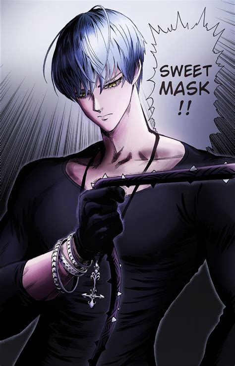 During the invasion of the Seafolk, he was sporting a shorter hairstyle with his hair parted to the right. He is seen with long hair again when he addresses the Hero Association official and, in his most recent appearance, he is again shown with his short hair. Interestingly, Sweet Mask's eyes seem to turn from a yellow into a blood-red when extremely angered.